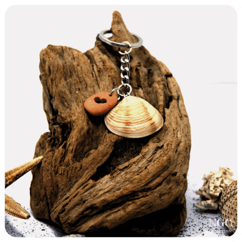Porte-clés unique Assemblage d'un coquillage et d'une brique polie ajourée en forme de cœur, accompagné de son cabochon "Ngc Création".
