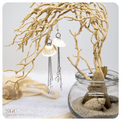 Paire de boucles d'oreilles unique L'alliance de 2 arapèdes mexicaines, de morceaux de chaine et de perles de quartz pour toujours avoir une paire de méduse à vos oreilles. Fournitures utilisées : ~ chaines et anneaux en acier inoxydable ~ crochets d'oreilles en argent 925 ~ perles de quartz translucides, 2 tailles Informations utiles : ~ Hauteur : environ 7 cm ~ Poids : Tous les clichés des modèles ont été réalisés par le talentueux photographe Kadder Bouzian. http://kadderbouzian.com/