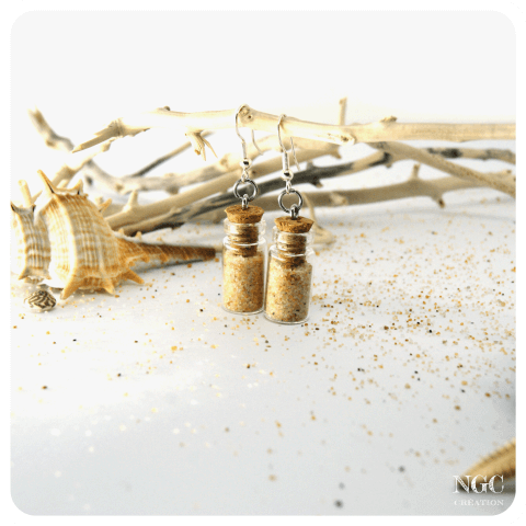 Boucles d'oreilles faites de petites bouteilles en verre remplies de sable. Crochets d'oreilles en argent 925 et anneaux en acier inoxydable. Coloris : sable miel Taille 2 : 2,2 cm de hauteur par 1,1 cm de diamètre Poids : environ 3 g la boucle