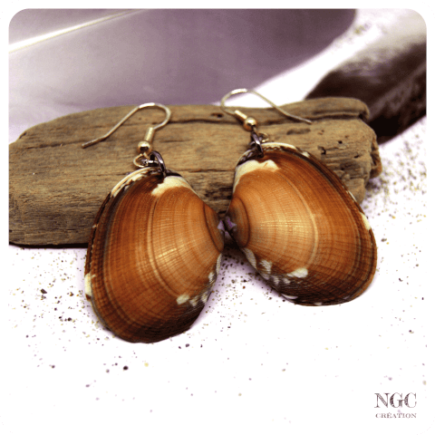 Paire de boucles d'oreilles unique. Les deux faces du même coquillage pour sublimer votre visage. Crochets d'oreilles en argent 925 et anneaux en acier inoxydable. ~ Taille approximative : 3,5 cm de haut par 2,4 cm de large ~ Poids de la paire : inférieur à 1 g