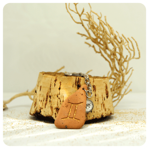 Porte-clés unique Brique polie avec le signe des Gémeaux gravé et peint en or-cuivré à la main, accompagnée de son cabochon "Ngc Création".
