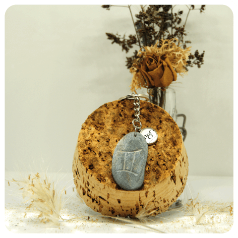 Porte-clés unique Galet naturel avec le signe des Gémeaux gravé à la main, accompagné de son cabochon "Ngc Création".